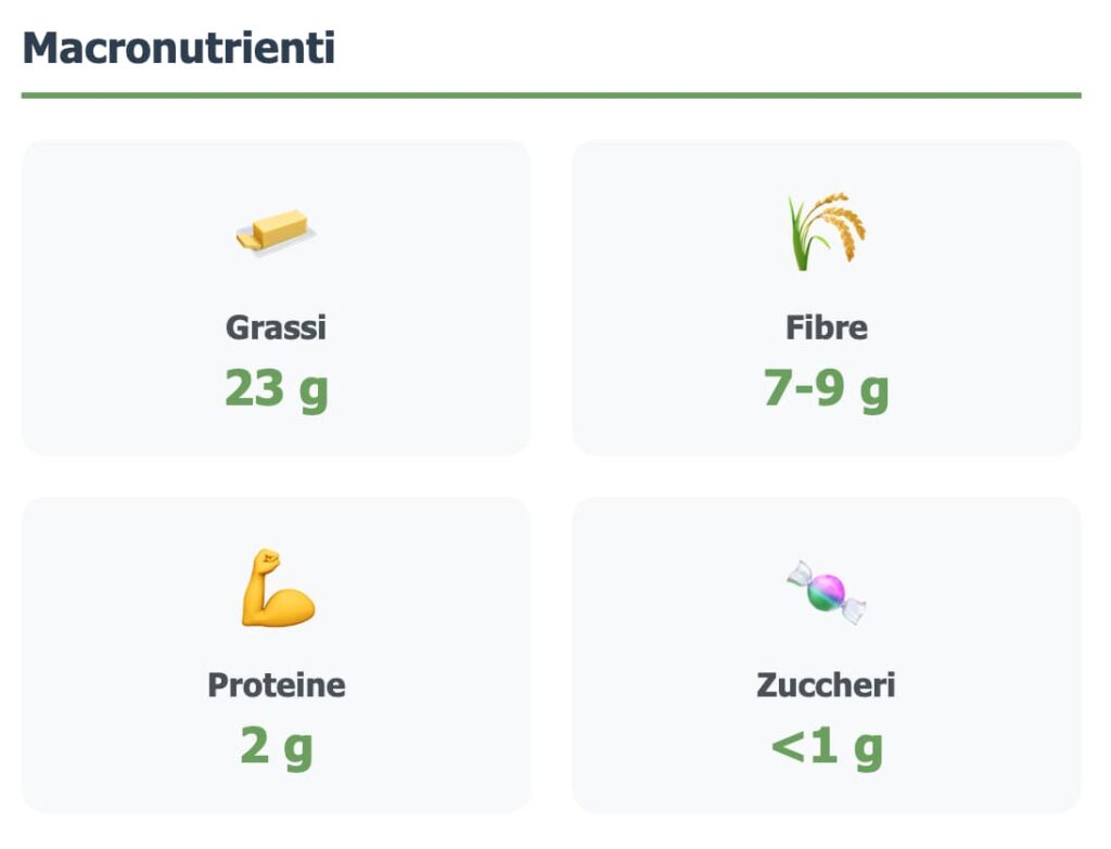 In 100 grammi di polpa troviamo circa 230 calorie, derivanti principalmente dai grassi che costituiscono il 23% del peso. Ma non si tratta di grassi qualsiasi: circa l’80% è rappresentato dall’acido oleico, lo stesso acido grasso monoinsaturo omega-9 presente nell’olio extravergine d’oliva, noto per i suoi effetti protettivi sul sistema cardiovascolare.