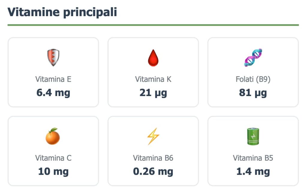 Da notare la presenza di composti bioattivi come i carotenoidi (luteina e zeaxantina), importanti per la salute degli occhi, e i fitosteroli, sostanze vegetali strutturalmente simili al colesterolo che ne competono per l’assorbimento intestinale, contribuendo a ridurne i livelli ematici.